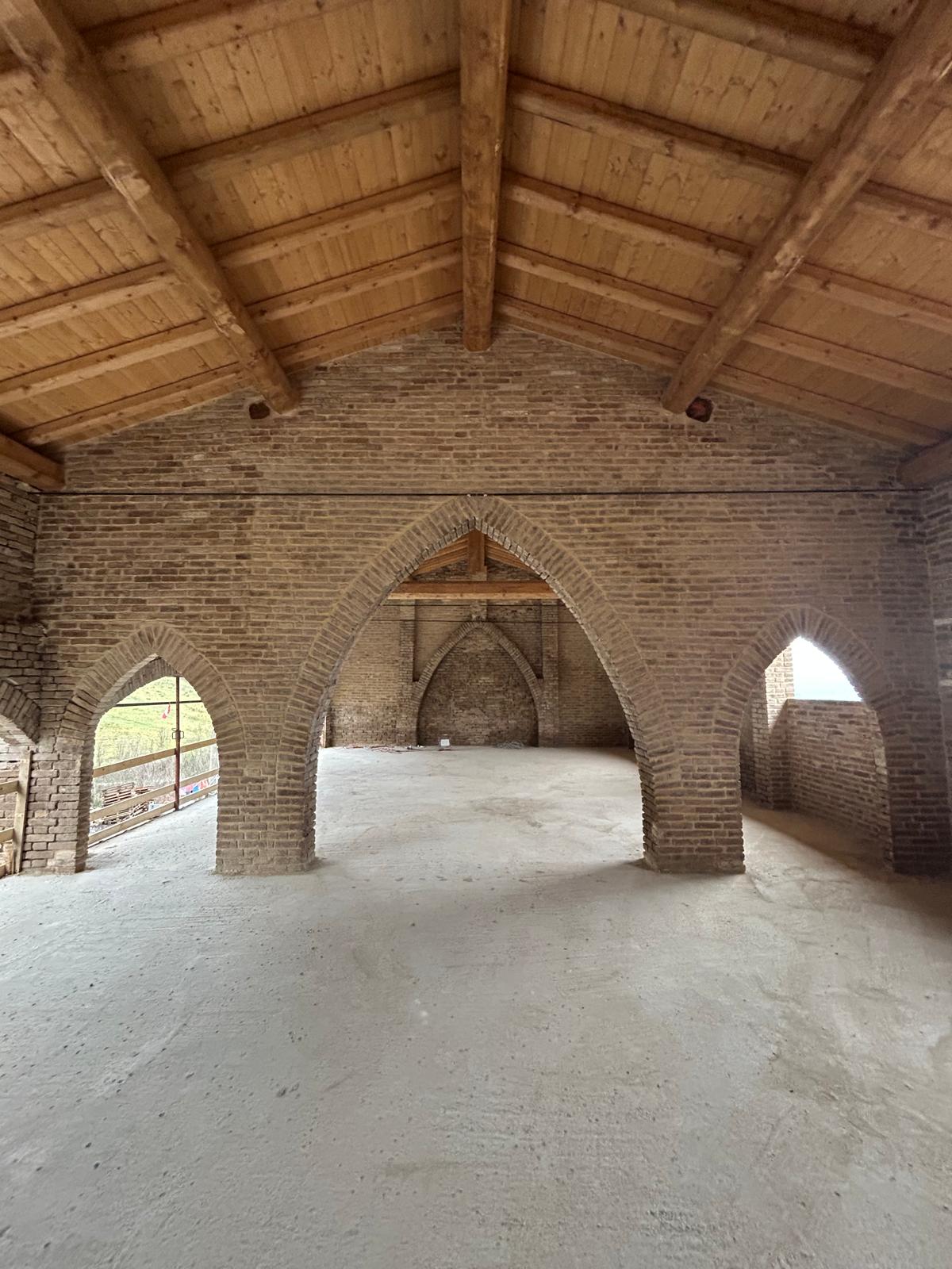 murature in mattoni, archi e tetto in legno a vista.